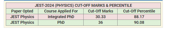 | JEST Physics | Integrated PhD | 30.33 | 88.17 |