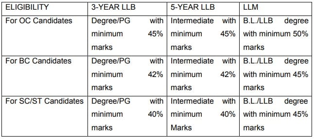 | For SC/ST Candidates | Degree/PG with minimum 40% marks | Intermediate with minimum 40% marks | B.L./LLB degree with a minimum of 45% marks |