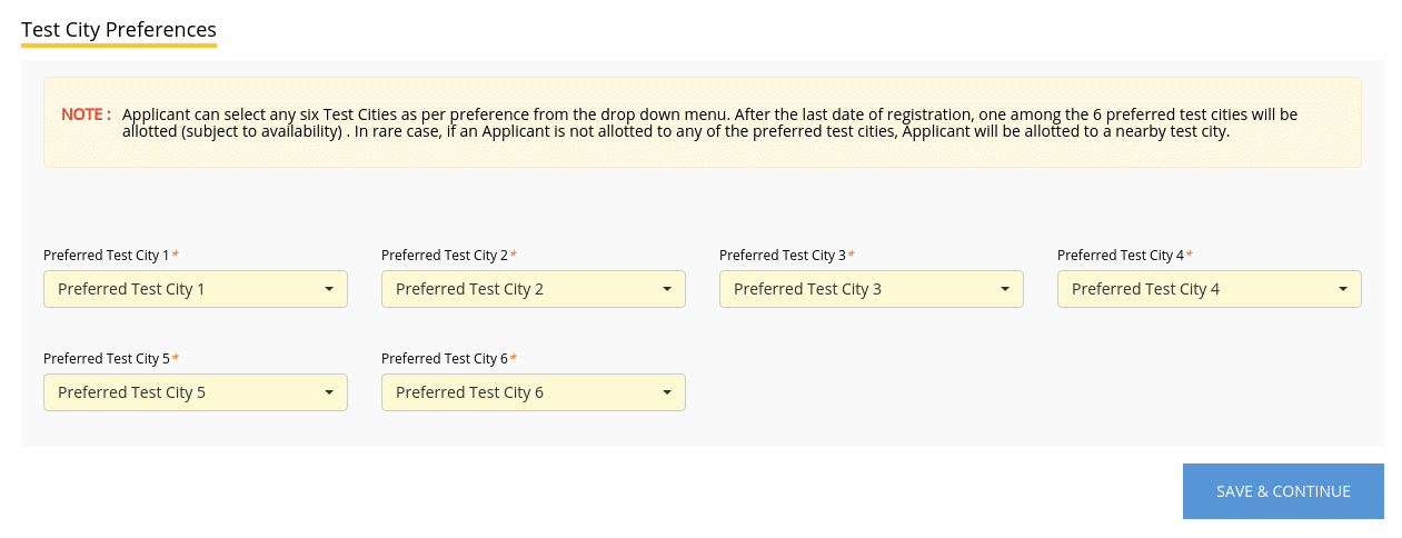 - Candidates will be required to select six exam cities based on their preferences during the registration process.