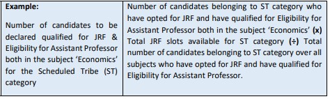 - Step 6: Allocation of JRF Slots: Candidates who have applied for JRF and are eligible for Assistant Professor, among the total number of qualifying candidates determined in Step 4, are considered for JRF. The total slots available for JRF are distributed across various categories based on the Government of India’s reservation policy. The allocation of JRF slots for each subject and category follows a specific formula.